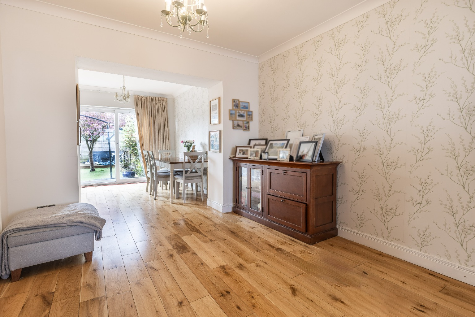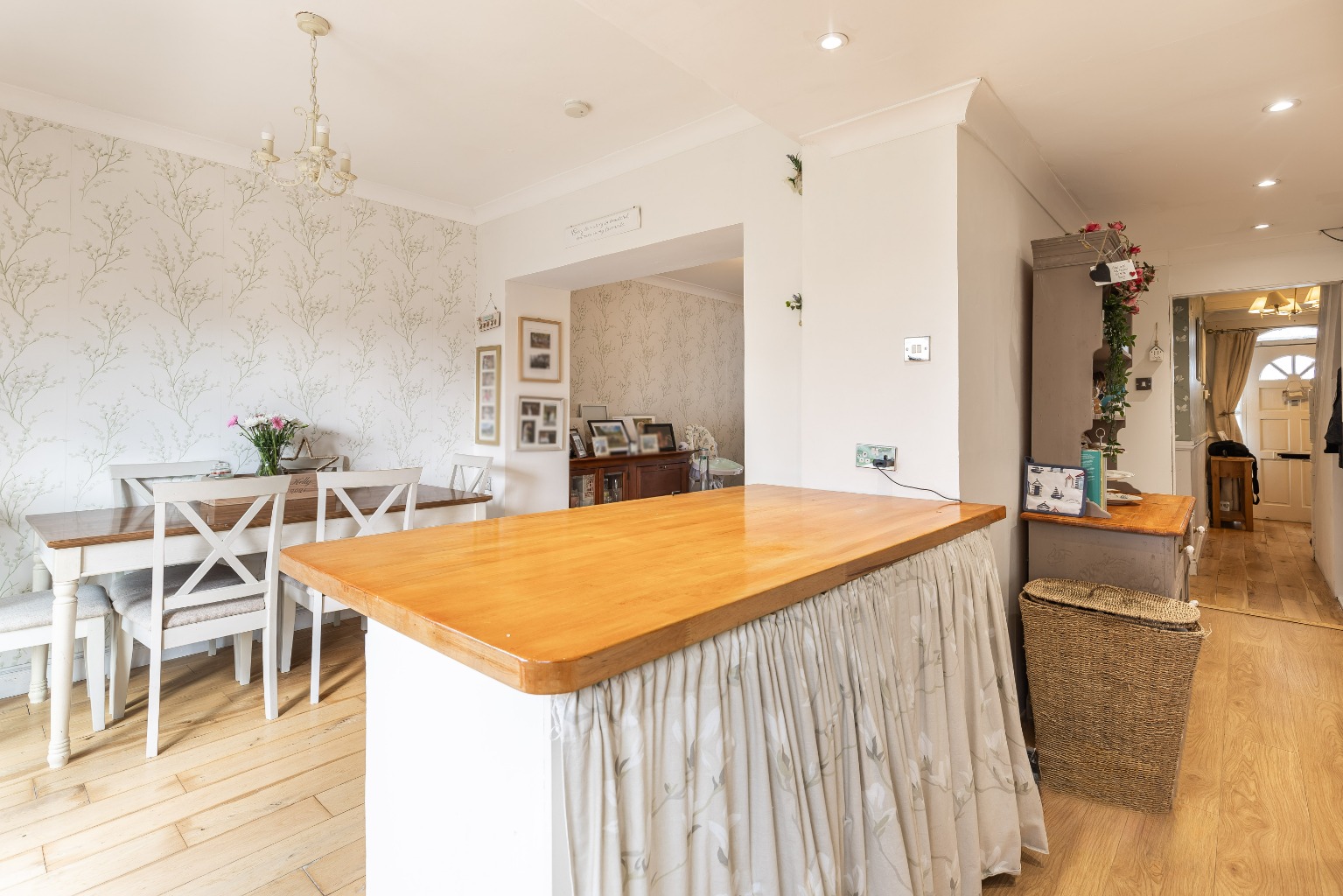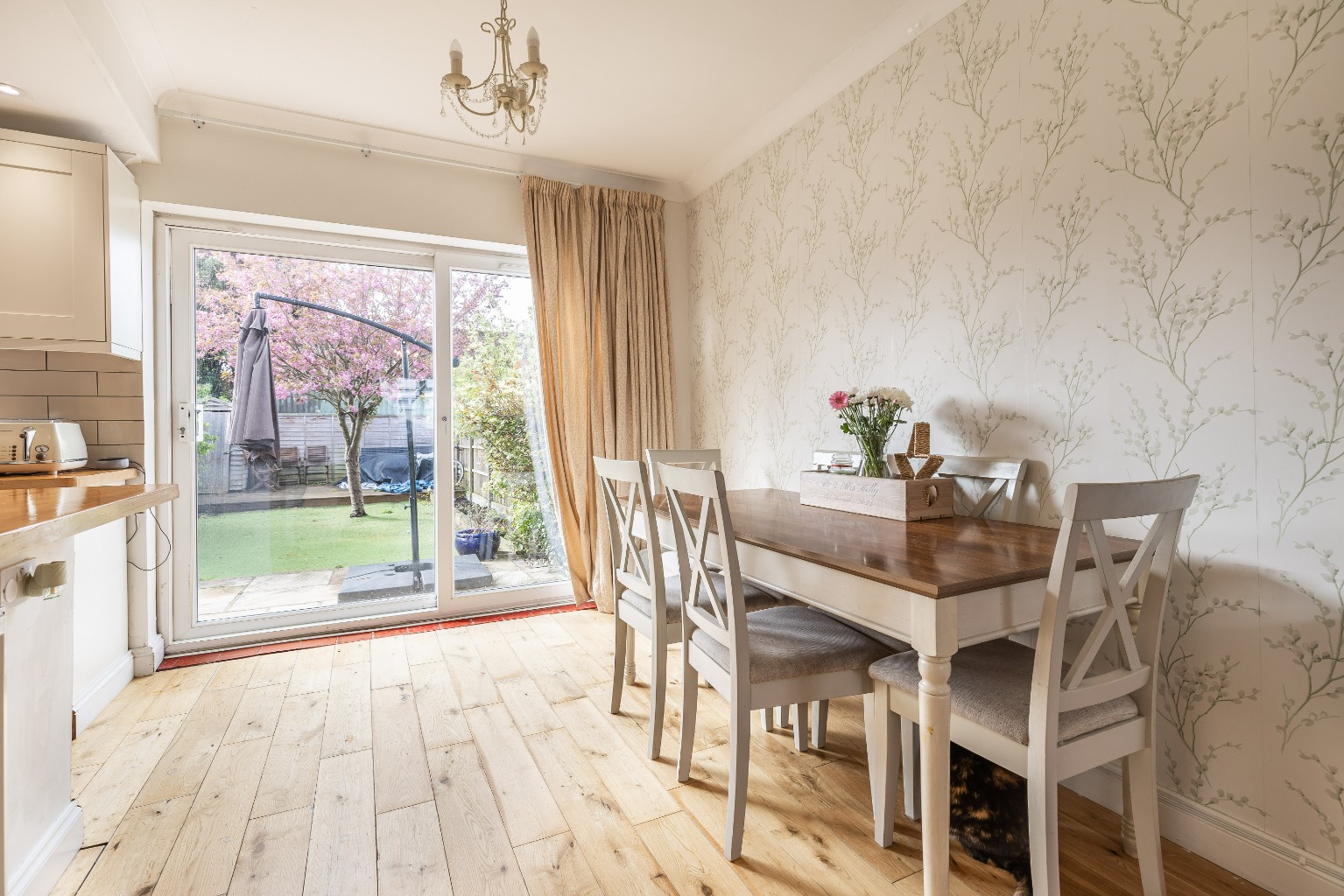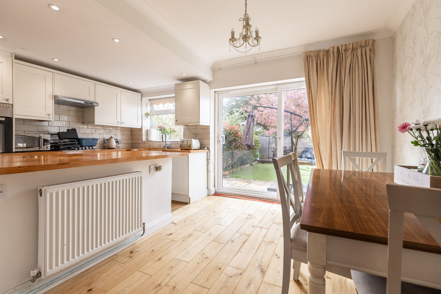 Continuing through, the house offers an open plan kitchen with a breakfast bar, seamlessly flowing into a well-designed dining area. The kitchen is modern and fully fitted, allowing for smooth culinary experiences. It also features patio doors that lead onto the patio and south facing garden, providing a delightful outdoor space for al fresco dining, gardening, or simply unwinding after a long day.