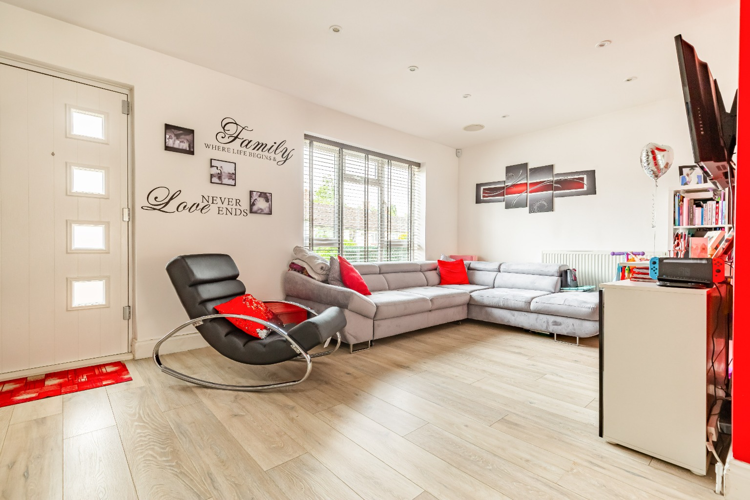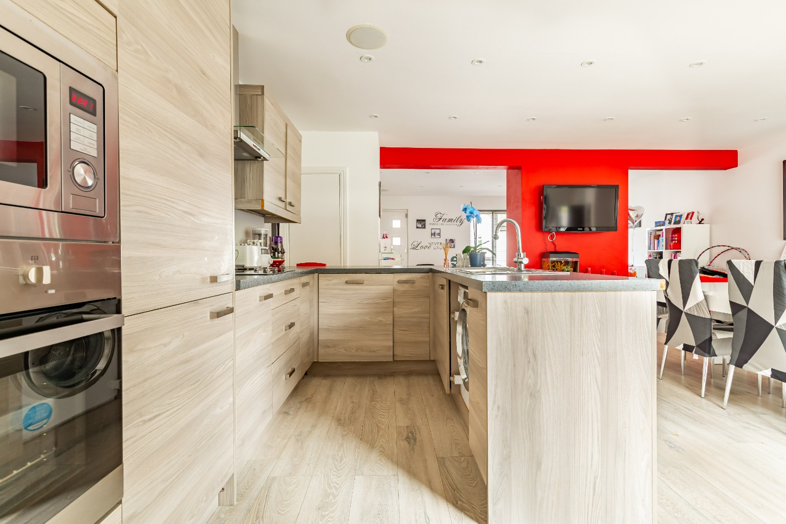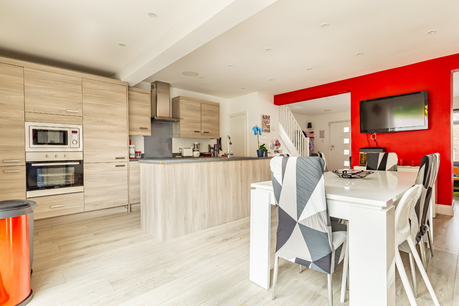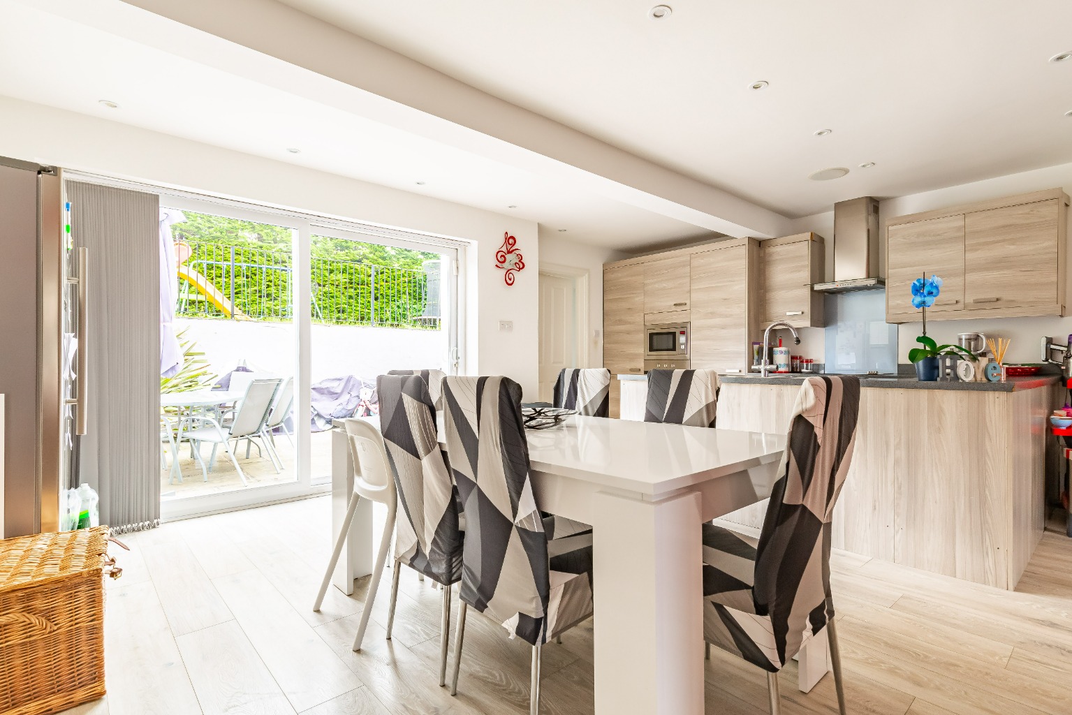 The property is presented in immaculate condition and offers a fantastic open plan layout to the whole of the ground floor. There is a spacious lounge area to the front which has a bright and welcoming feel aided by the large double glazed windows. The contemporary styled kitchen with contrasting units and worktops is complete with integrated appliances and flows perfectly with the dining area, benefiting views of the landscaped garden via the full length patio doors.