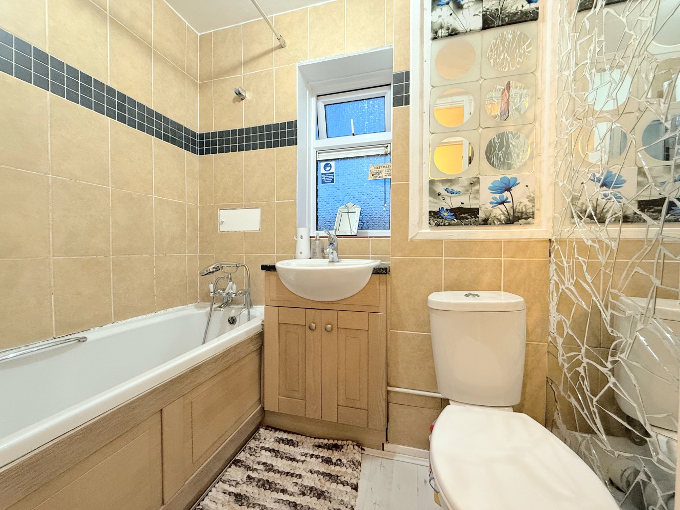 The fully tiled bathroom is complete with a bath and shower, providing the utmost convenience and versatility. The modern fixtures and fittings add the perfect finishing touch to this contemporary bathroom.