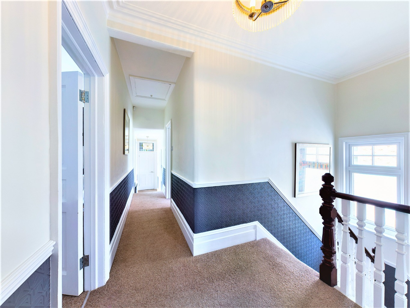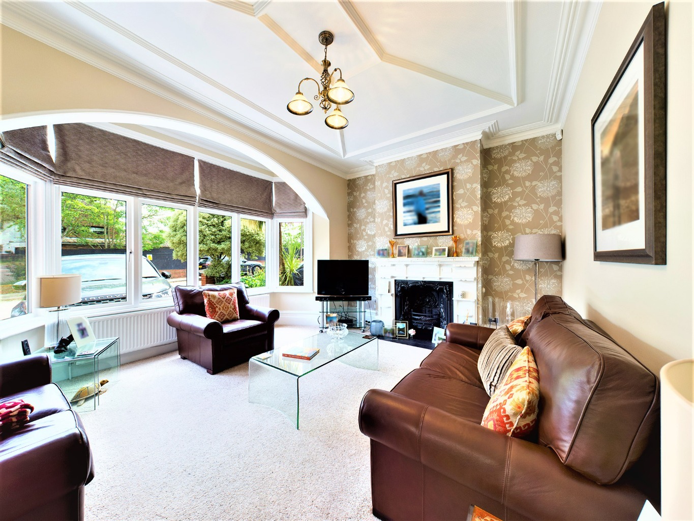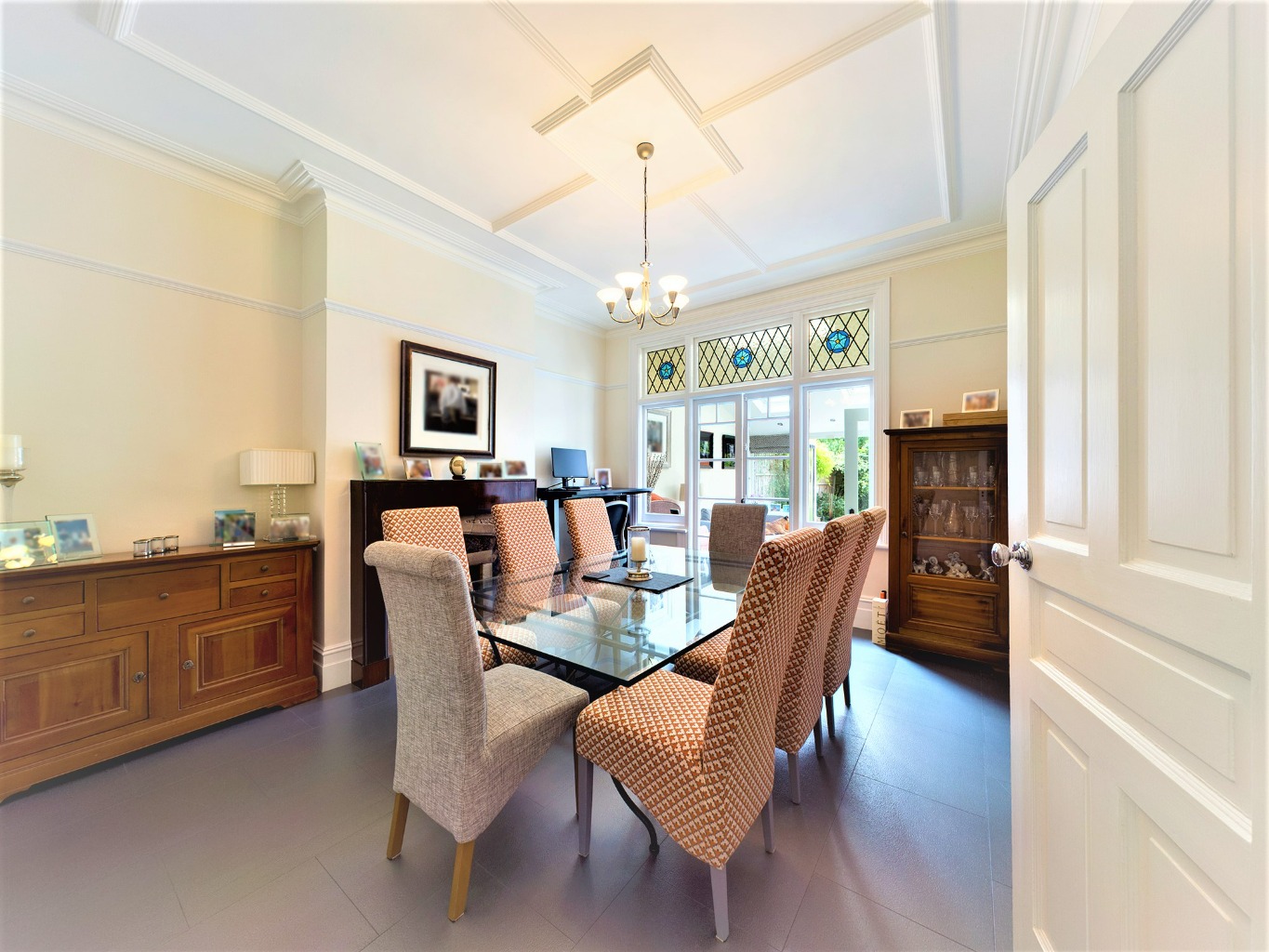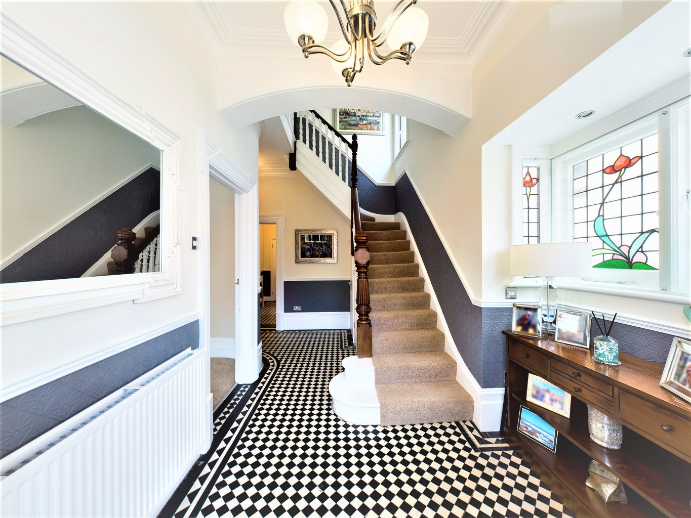 Walking through the front door into the wide entrance hall you are greeted with a sweeping stairway and a taste of the period of this home with it's high ceilings and skirting boards, covings, original restored tiled flooring and bay window with coloured led lights to the side of the property. The bright spacious lounge is immaculately presented and offers a large bay window allowing lots of natural light and a beautiful feature fireplace. The second reception room, dining room, also offers a feature fireplace and doors onto a delightful sun room with french doors onto the garden, velux windows and doorway to the fitted kitchen offering a range of high quality wall and base level units with granite work surfaces. A spacious shower room completes the ground floor layout with hallway complimenting the entrance hall offering matching tiled flooring.