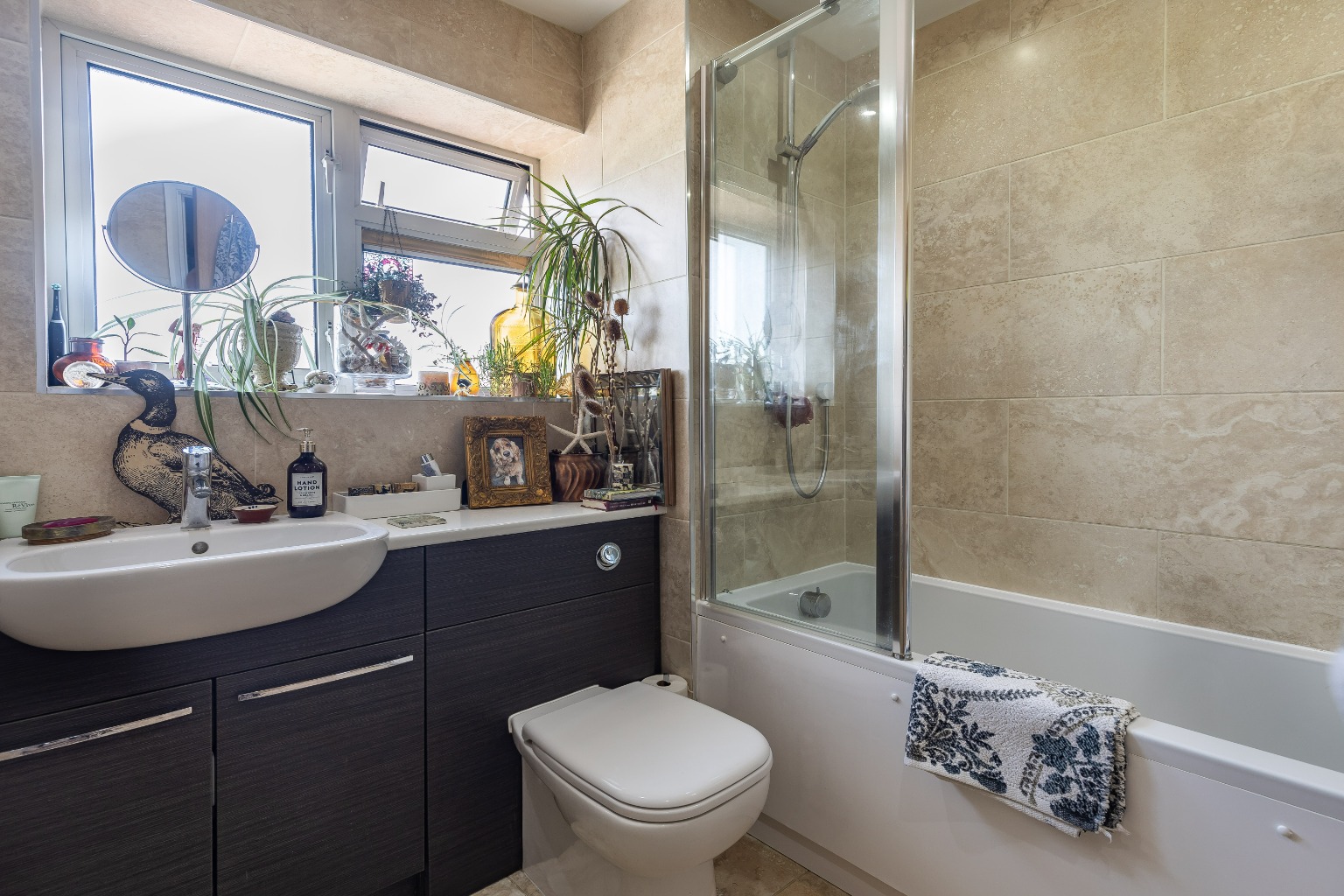 The bathroom is tastefully designed and features a contemporary suite, including a bathtub with an overhead shower, a WC, and a washbasin. It offers the perfect space for pampering and unwinding after a long day.