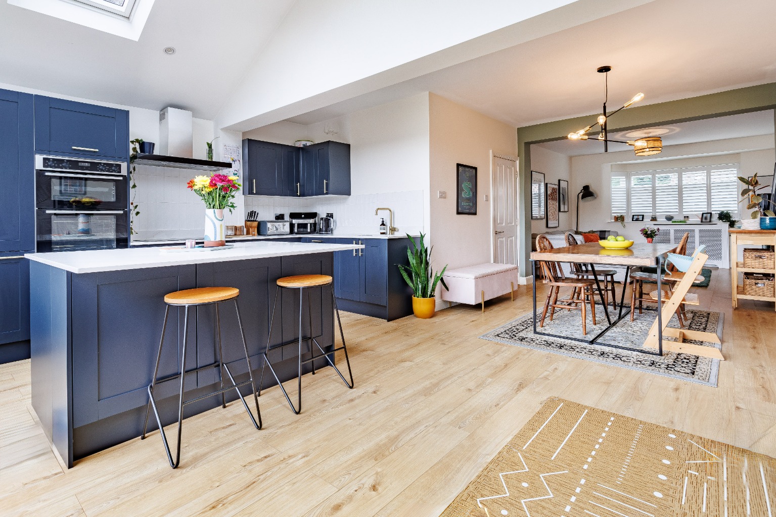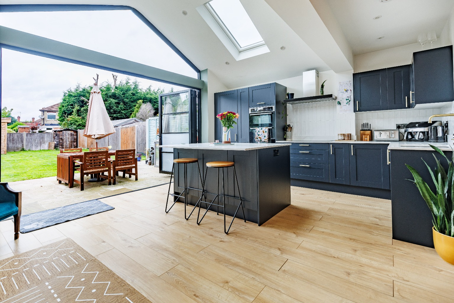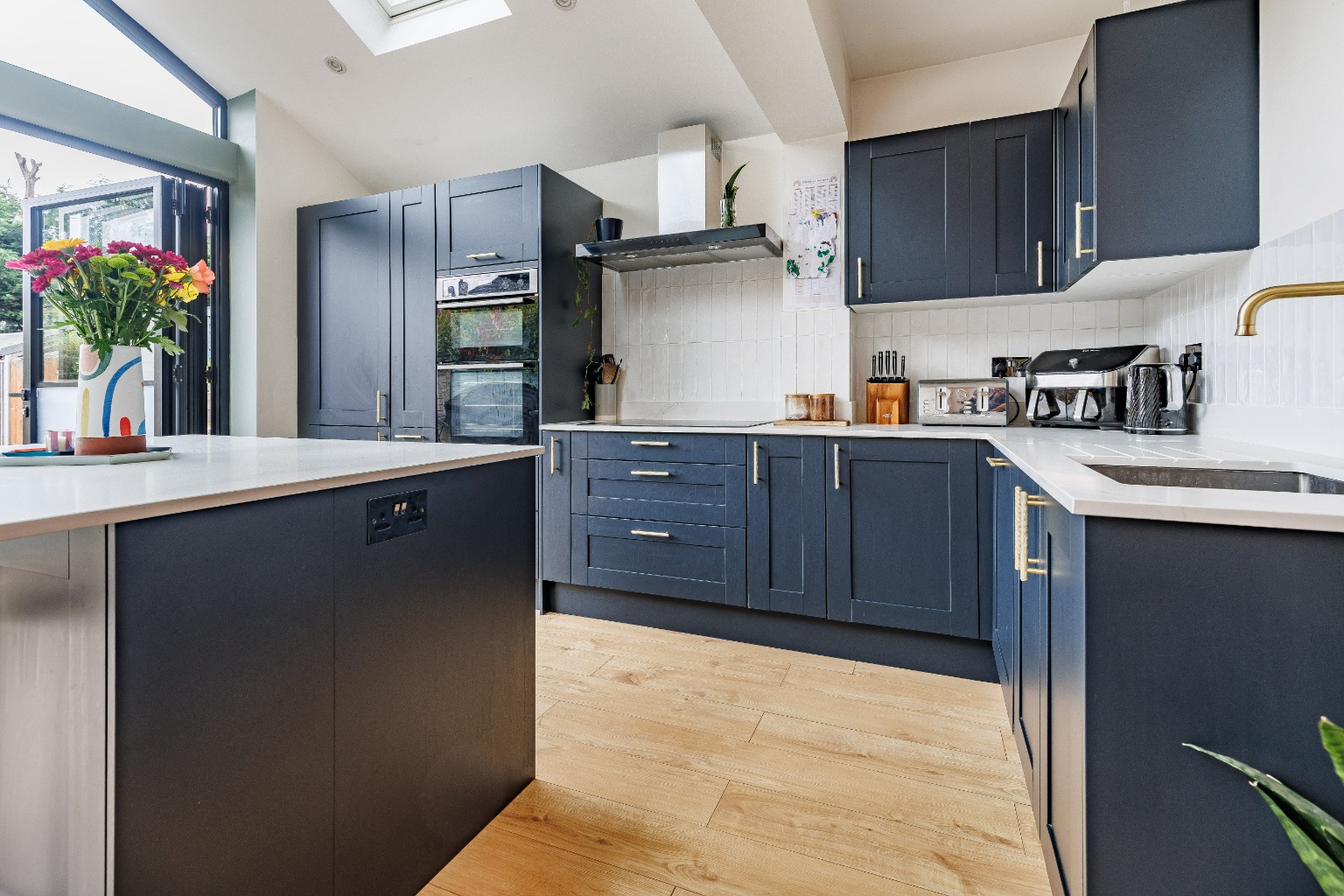 The ground floor features a wonderful lounge-diner offering both space to relax and unwind and also enjoy meals with family and friends. The stunning rear extension offers a truly impressive kitchen-family room, beautifully designed to be the heart of the home. Boasting sleek, modern cabinetry, high-end appliances, and an expansive island with a breakfast bar, making it perfect for both everyday living and entertaining. The skylight windows set within the pitch roof design flood the room with natural light, whilst the bi-fold doors seamlessly connect this area to the patio terrace, creating a versatile indoor-outdoor space that is sure to impress your guests.