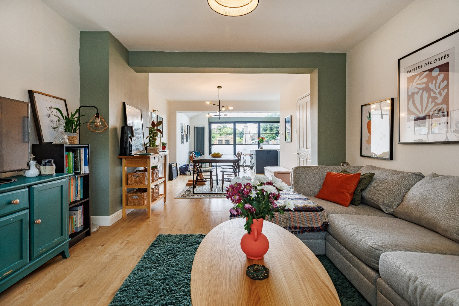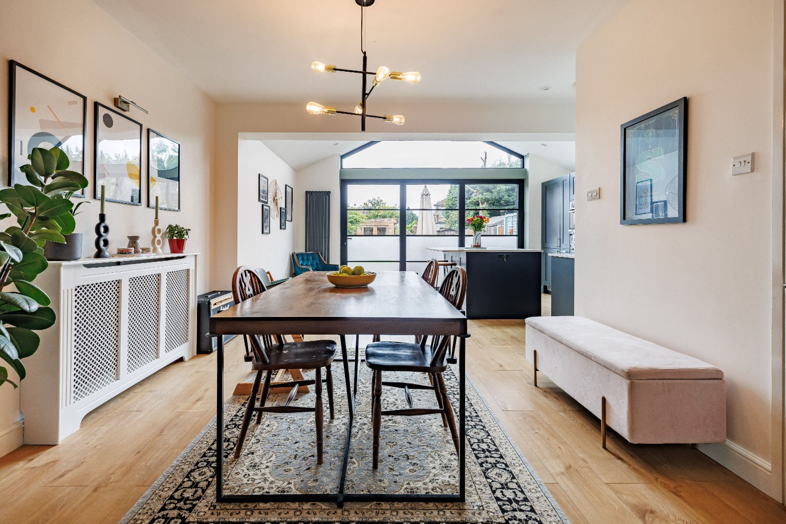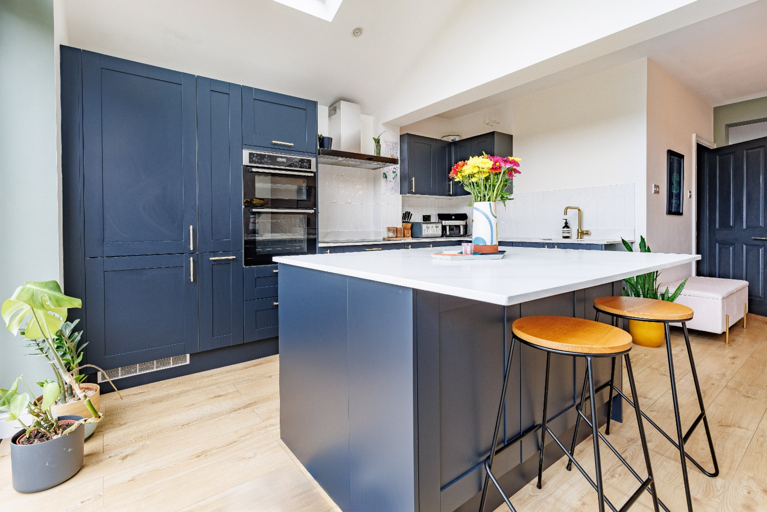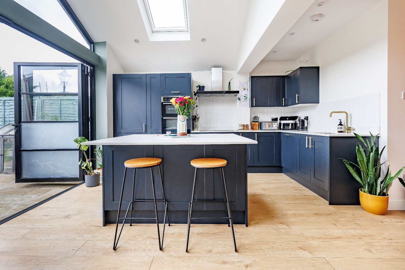 The ground floor features a wonderful lounge-diner offering both space to relax and unwind and also enjoy meals with family and friends. The stunning rear extension offers a truly impressive kitchen-family room, beautifully designed to be the heart of the home. Boasting sleek, modern cabinetry, high-end appliances, and an expansive island with a breakfast bar, making it perfect for both everyday living and entertaining. The skylight windows set within the pitch roof design flood the room with natural light, whilst the bi-fold doors seamlessly connect this area to the patio terrace, creating a versatile indoor-outdoor space that is sure to impress your guests.